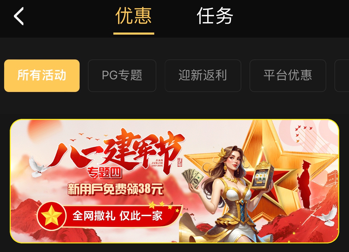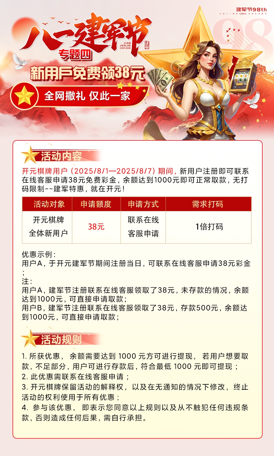 8月1号-8月7号期间注册才送38彩金一倍流水,最低1000提现,联系客服领取