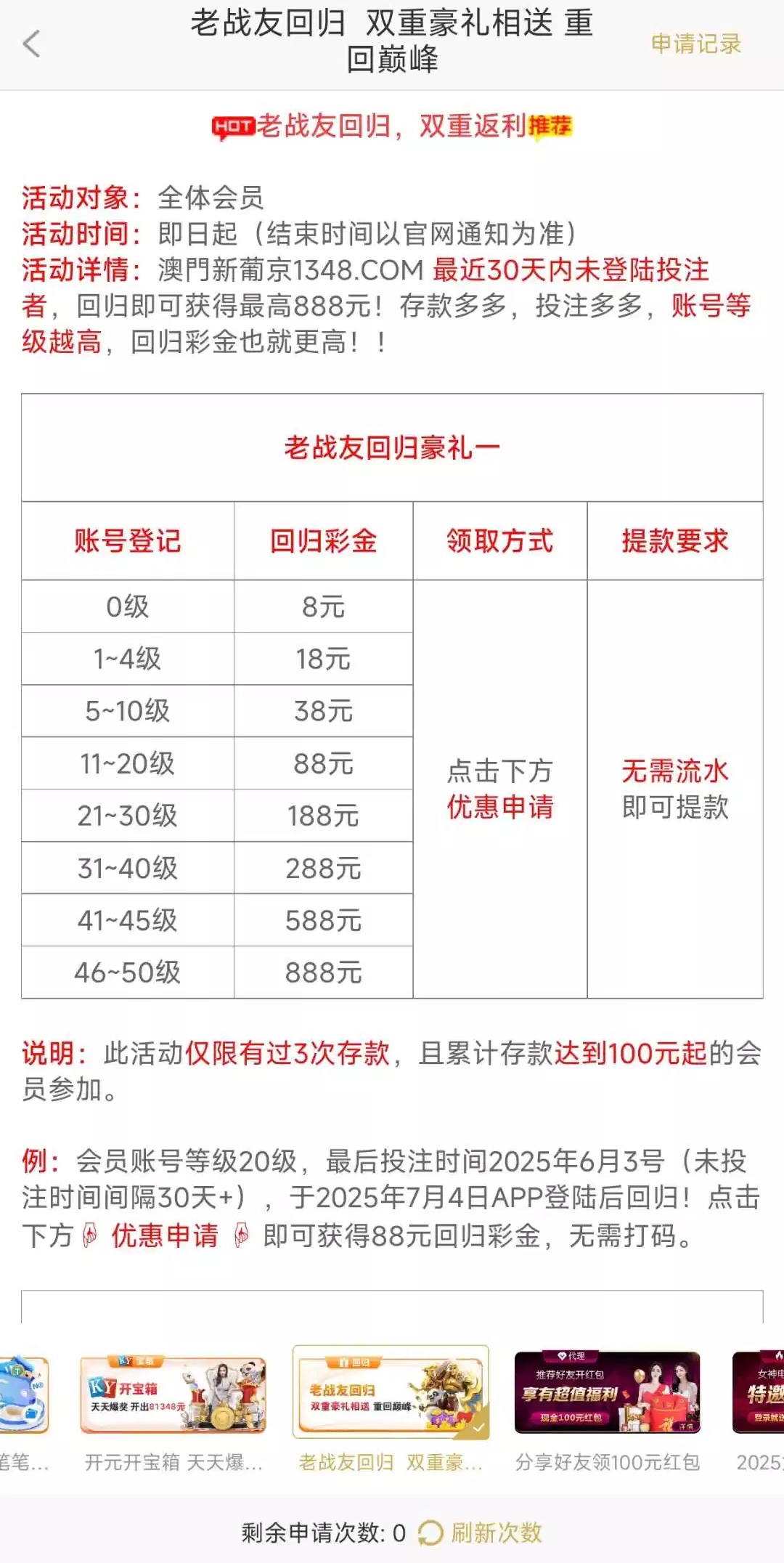 近期30天内未登入投注过并历史充值过3次以上累计存款100以上才能领取,符合的兄弟可以去看看
